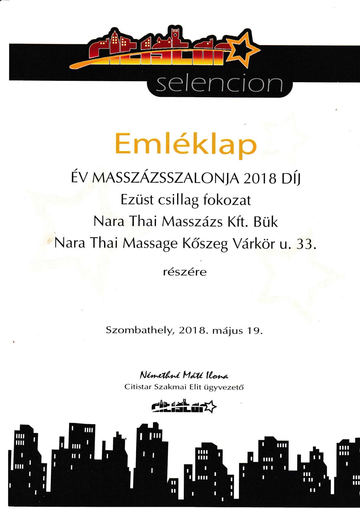 In both years 2017 and 2018, Nara Thai Massage Ltd. received a prize at the award ceremony organised by the online magazine "citistar.hu". These awards are given to local entrepreneurs for consumer satisfaction, professionalism and business success.